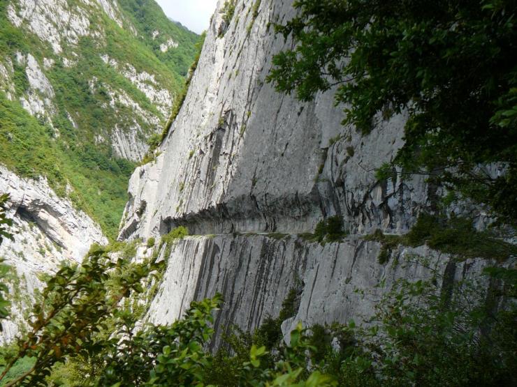Mais pour cela, il fallut faire franchir aux troncs un ravin étroit et à pic connu sous le nom de « gorges de l'Enfer ». Les hommes de l’ingénieur Leroy vont alors creuser à flanc de la falaise abrupte un passage suffisamment large et haut pour le passage de bœufs tirant des troncs.