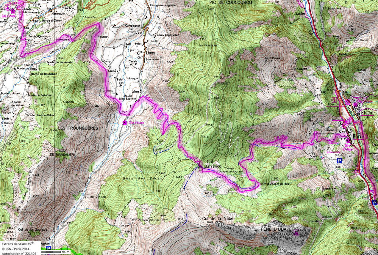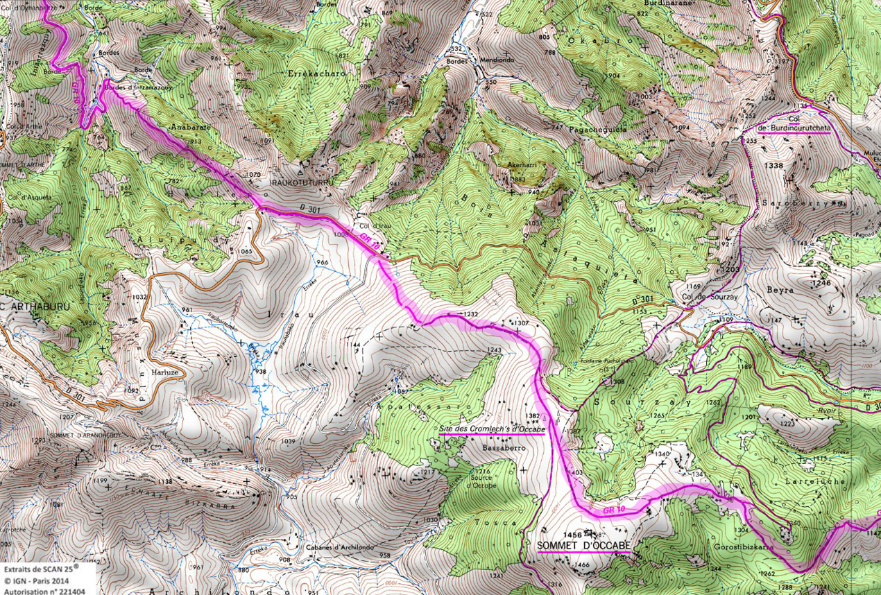 La montée se poursuit au sud, on traverse à gauche pour éviter le sommet d'Occabé. On redescend dans la prairie nord-est puis sud-est. On traverse les forêts pour rejoindre la