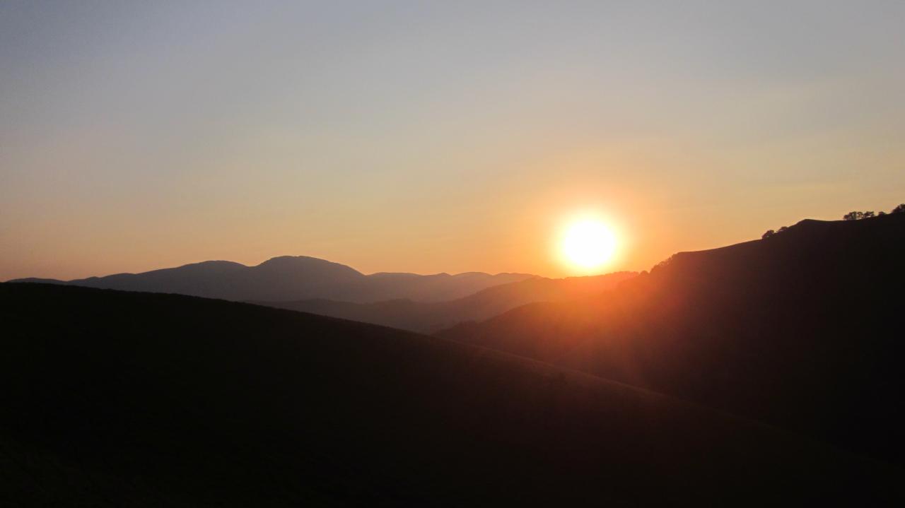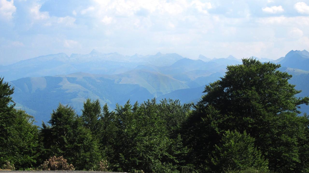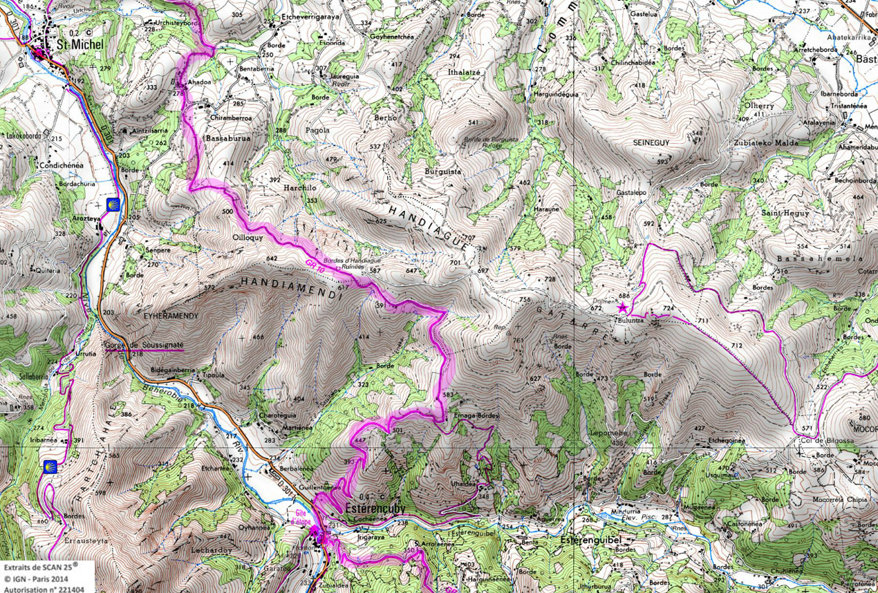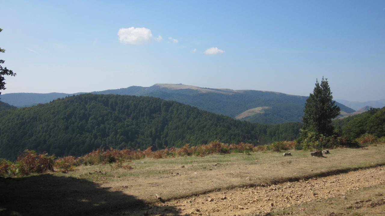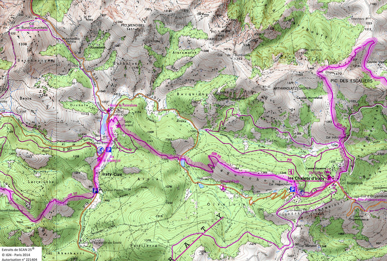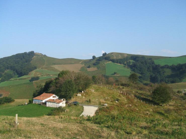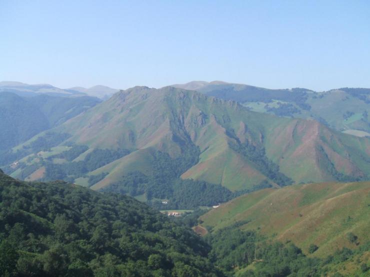 Juste après le virage, descendre à gauche par la route puis la piste jusqu'au col d'Iratzabaleta 1248m. Monter à droite au nord-est pour rejoindre une crête que l'on suit. Plus loin on évite à gauche le pic des Escaliers pour arriver