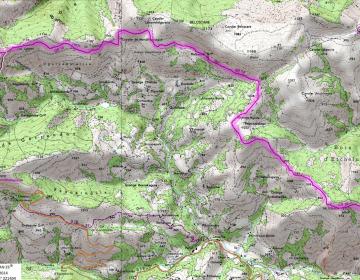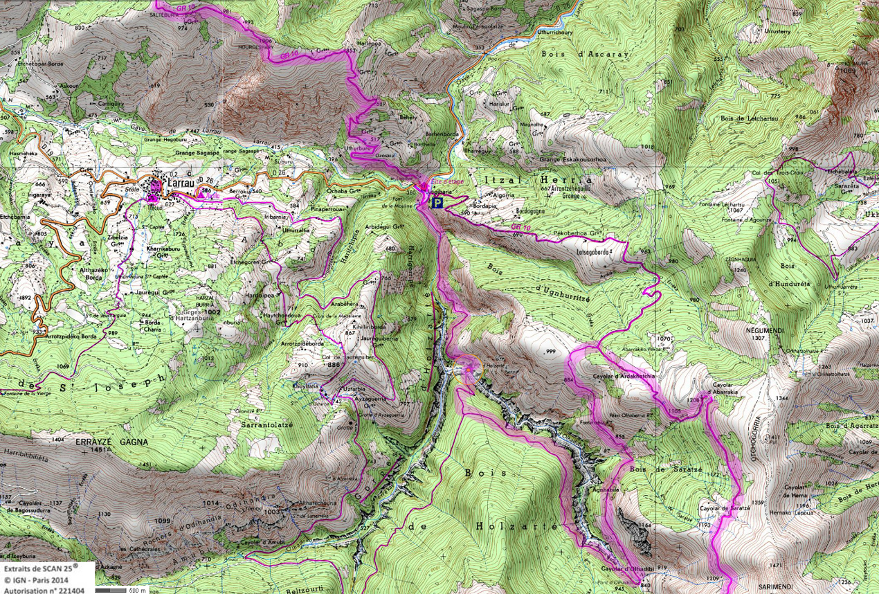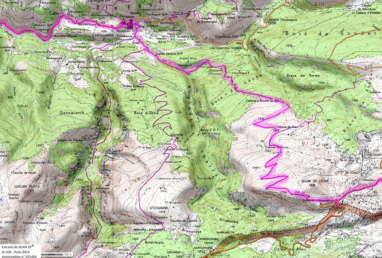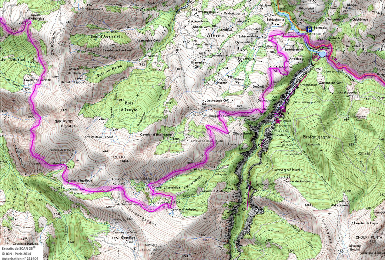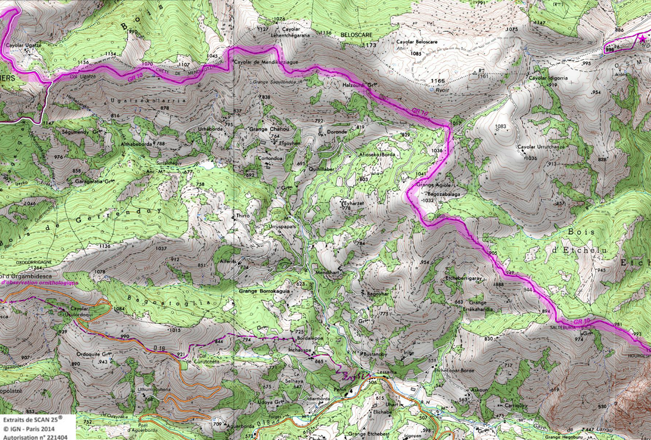 Remonter la piste sur la droite qui traverse au sud. Elle franchit plusieurs chainons sans trop prendre d'altitude un long moment. On passe au cayolar d'Olhaberria 1230m, un peu après le second cayolar le GR quitte la piste pour monter au sud-est et rejoint le