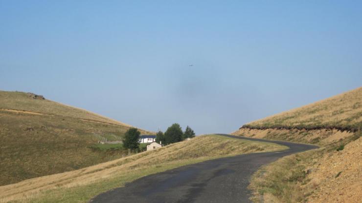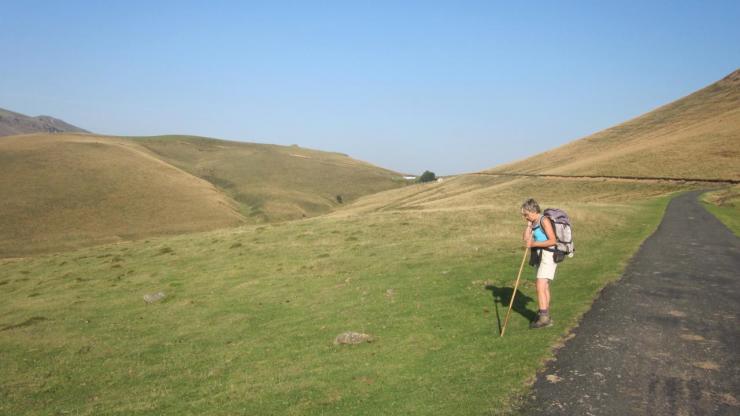 On descend d'abord à gauche puis à droite pour rejoindre une crête que l'on longe jusqu'à la route. Partir à droite puis à gauche à la bifurcation jusqu'au col tout proche d'