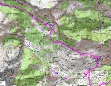 Suivre la route sur 300m et plonger dans le versant. Le GR recoupe la route un peu plus loin pour emprunter une piste pour arriver sans problème au village de
