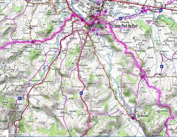 Devant l'église prendre la ruelle au nord-est et monter la rue tout droit. Le GR sort rapidement de la ville où il quitte le St-Jacques. Poursuivre tout droit au sud la route jusqu'à