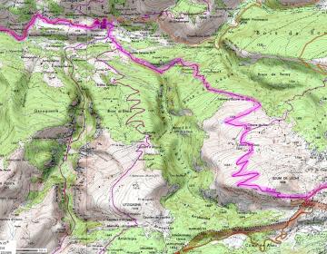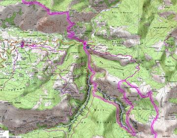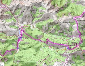 Direction sud-ouest, le GR traverse le village de Lescun puis rejoint une route qui conduit au pont du Moulin. Franchir le pont, quitter la route et monter pleine pente jusqu'au