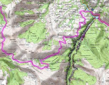 Traverser le village et suivre plein sud la route qui s'élève pour bientôt contourner par la droite un dôme. Le GR quitte ensuite la route qui se transforme en piste. Descendre au sud vers la rivière, la traverser et remonter à droite la piste qui remonte au hameau d'