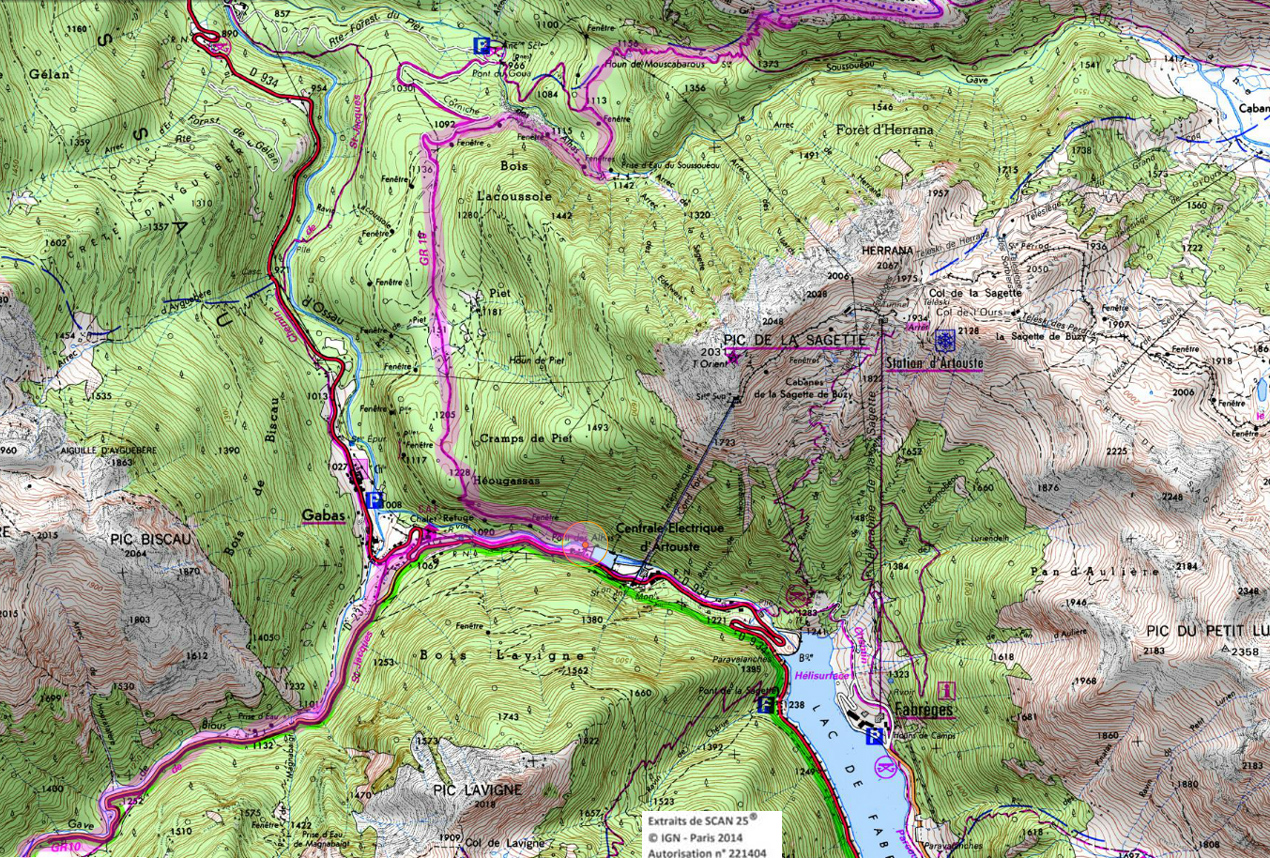Descendre par la route, puis bifurquer à droite en évitant un peu la route qu'on retrouve quand même un peu plus loin. On passe au-dessus de Gabas, pour remonter la route à droite sur 1,5 km. Le GR traverse la rivière juste avant un grand bassin d'eau et remonte au nord-ouest dans la forêt un long moment pour arriver au départ de la