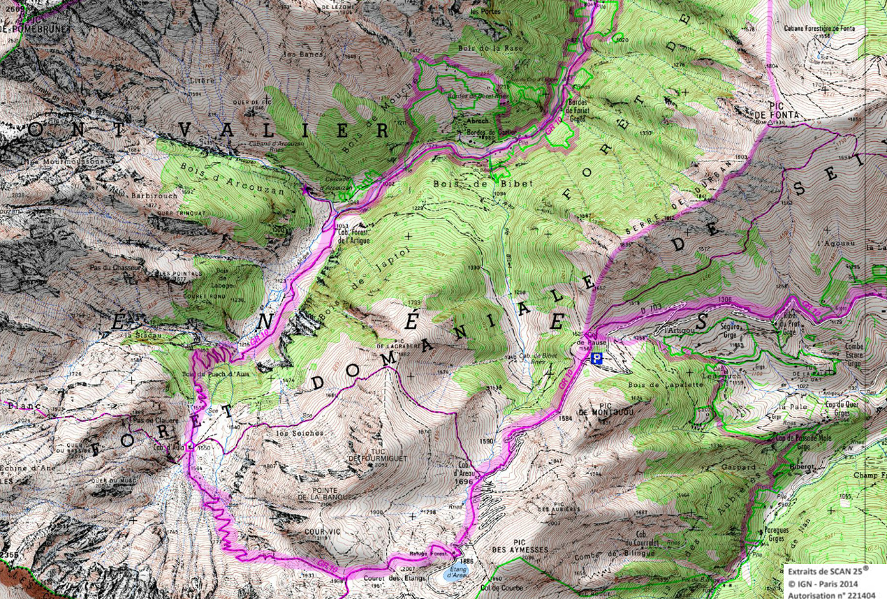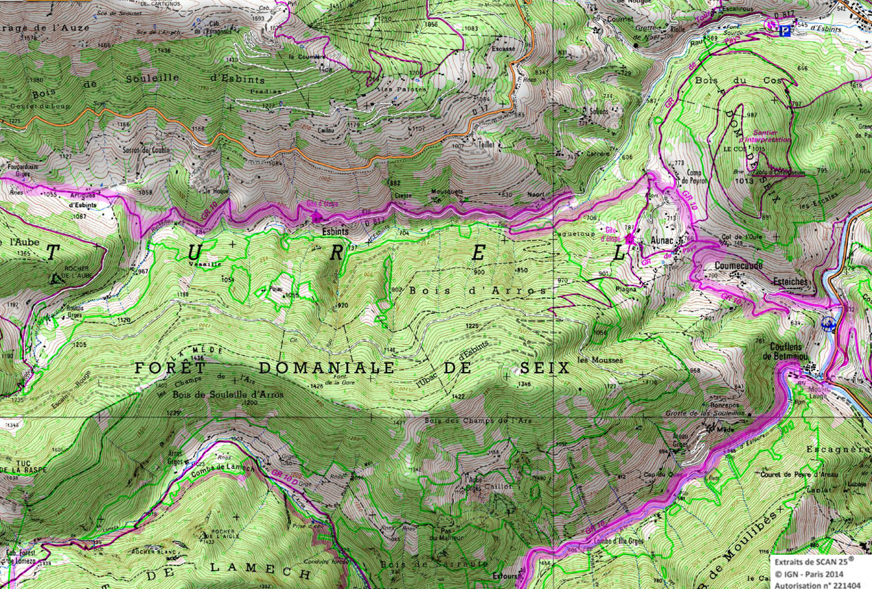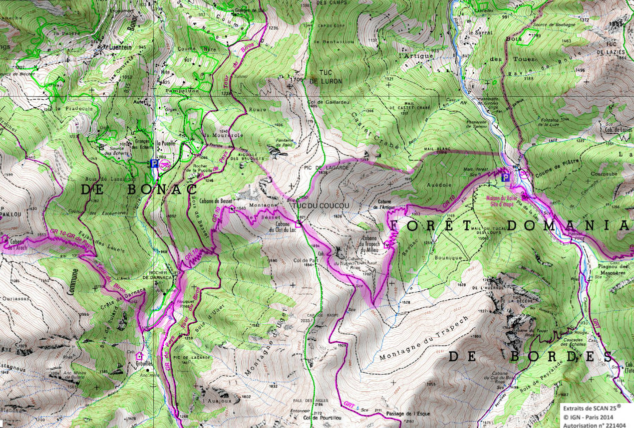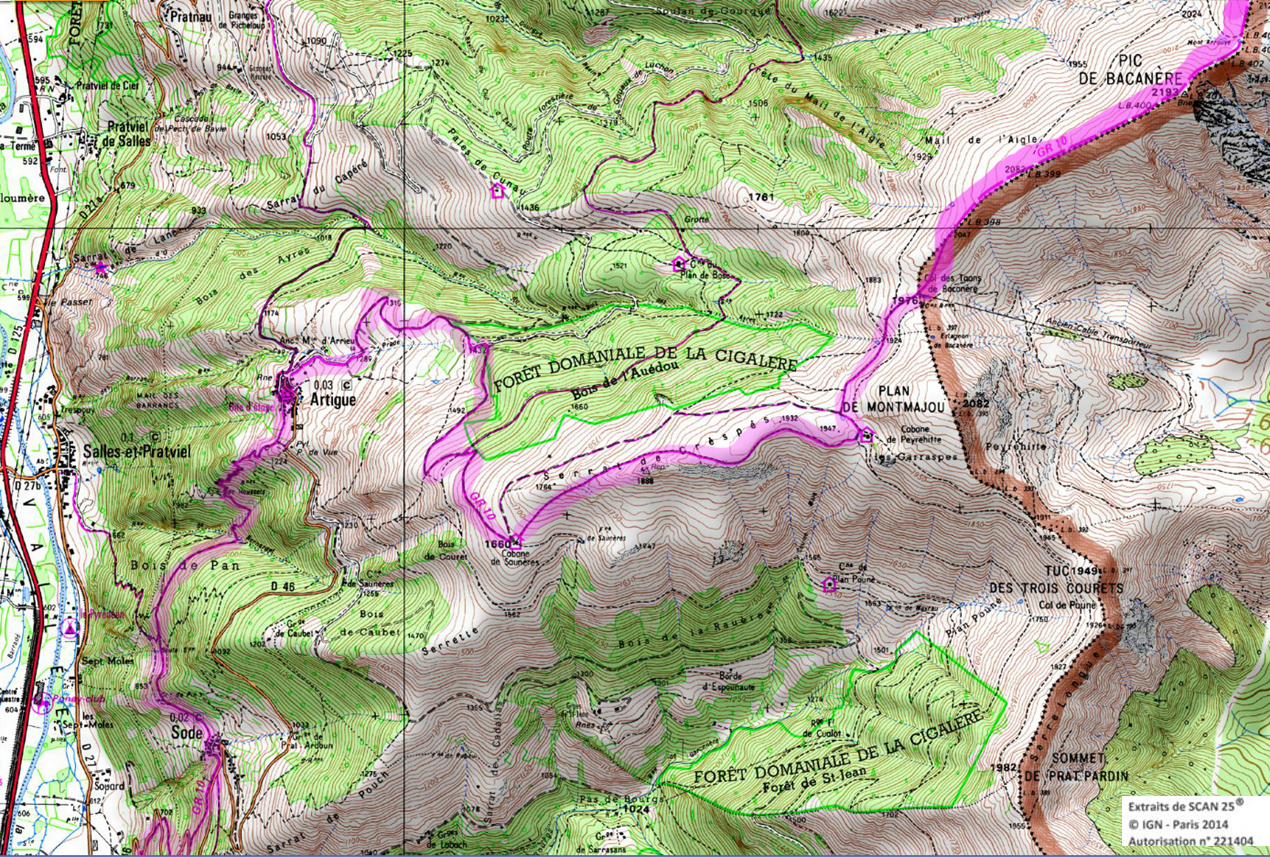 Descendre au sud-est et entrer dans la forêt jusqu'à la cabane d'Artigue 1354m. 50 m après la cabane descendre à gauche. Le GR coupe plusieurs fois une piste forestière et le ruisseau. Vers 1100m le GR retraverse le ruisseau pour suivre une piste qui rejoint la crête de Sacaube. On amorce la descente en une longue série de lacets jusqu'au