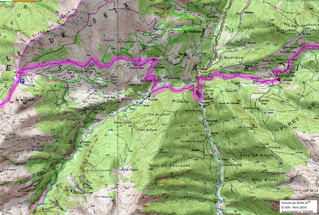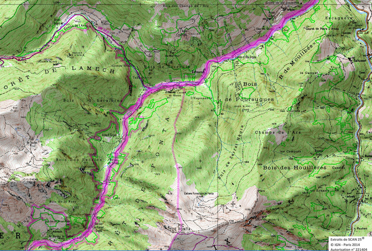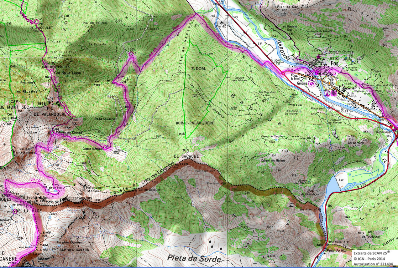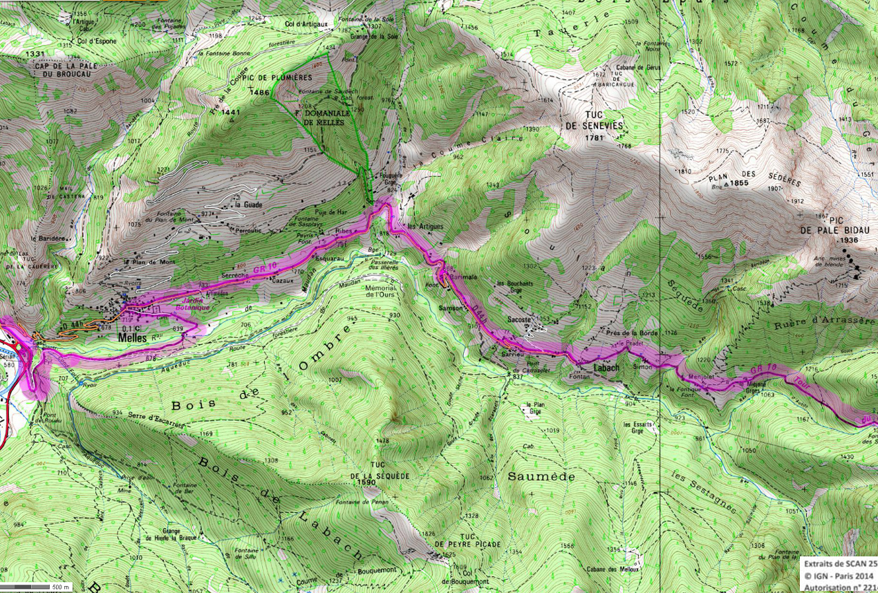 Descendre au sud-est et entrer dans la forêt jusqu'à la cabane d'Artigue 1354m. 50 m après la cabane descendre à gauche. Le GR coupe plusieurs fois une piste forestière et le ruisseau. Vers 1100m le GR retraverse le ruisseau pour suivre une piste qui rejoint la crête de Sacaube. On amorce la descente en une longue série de lacets jusqu'au