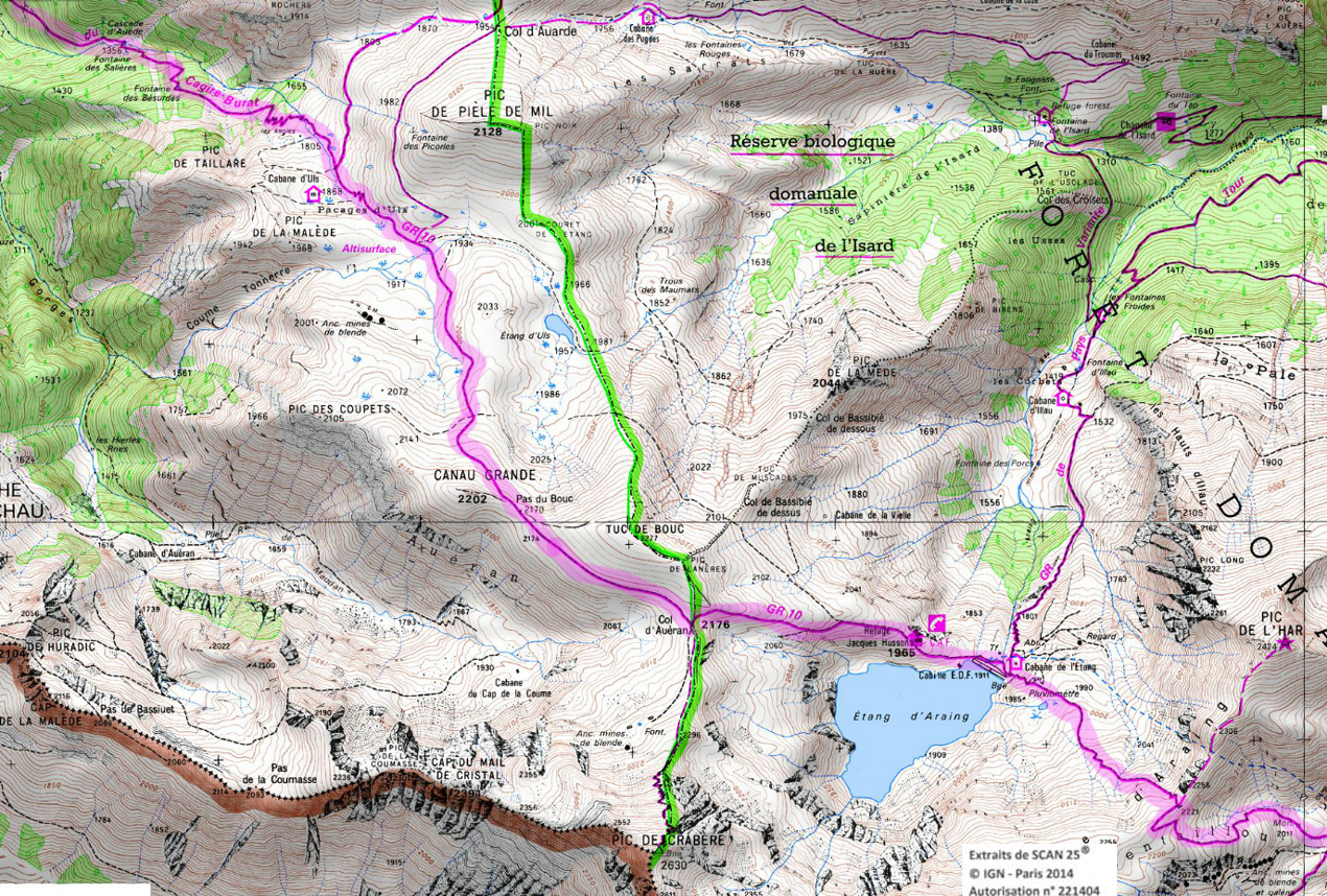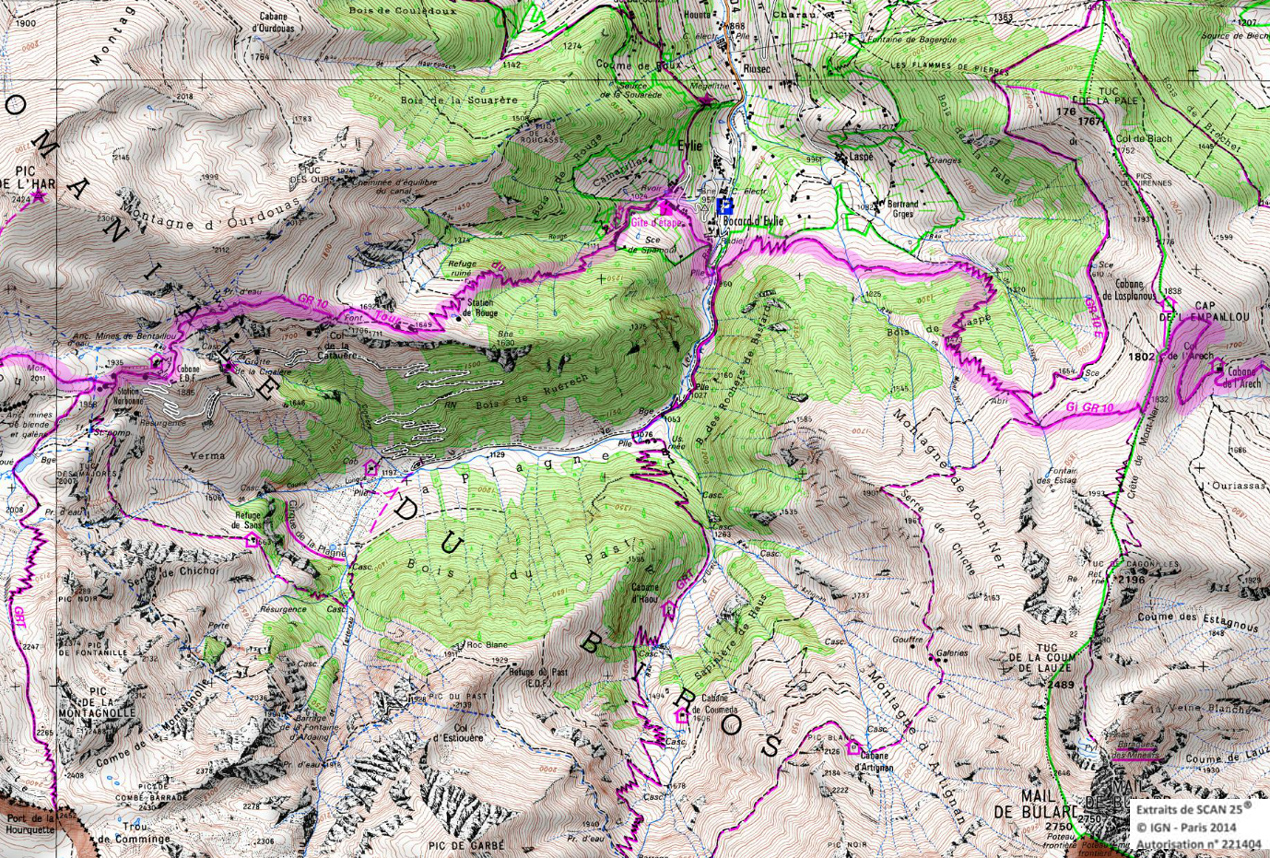 Hors GR, cent mètres avant la passerelle, un chemin sur la droite nous conduit en 10 mn à la cabane de Graouillès (10 places et eau).Franchir la passerelle et poursuivre le GR10. Un peu plus loin, on laisse à droite le tour du Biros pour filer à plat. A la prochaine bifurcation, il remonte à droite par une bonne grimpette à la