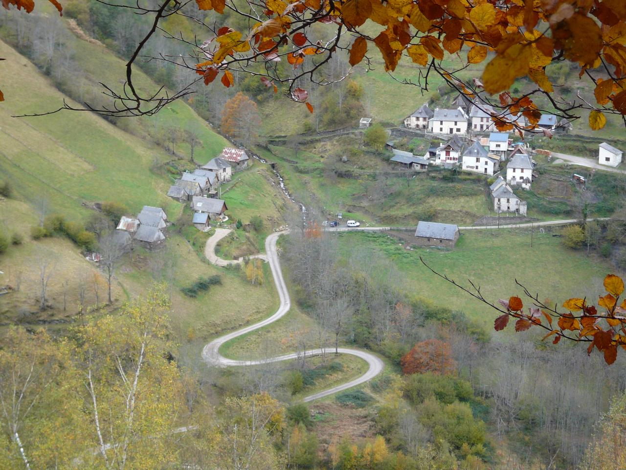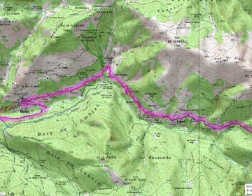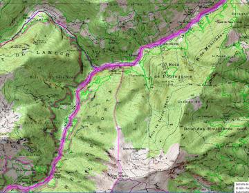 Descendre à la rivière et suivre le GR10 qui remonte le cours d’eau. Franchir 3 passerelles et suivre les panneaux (Muscadet). Plus loin, une très longue série de lacets grimpe dans la forêt de hêtres. Bien au dessus de celle-ci, on passe tout près de la