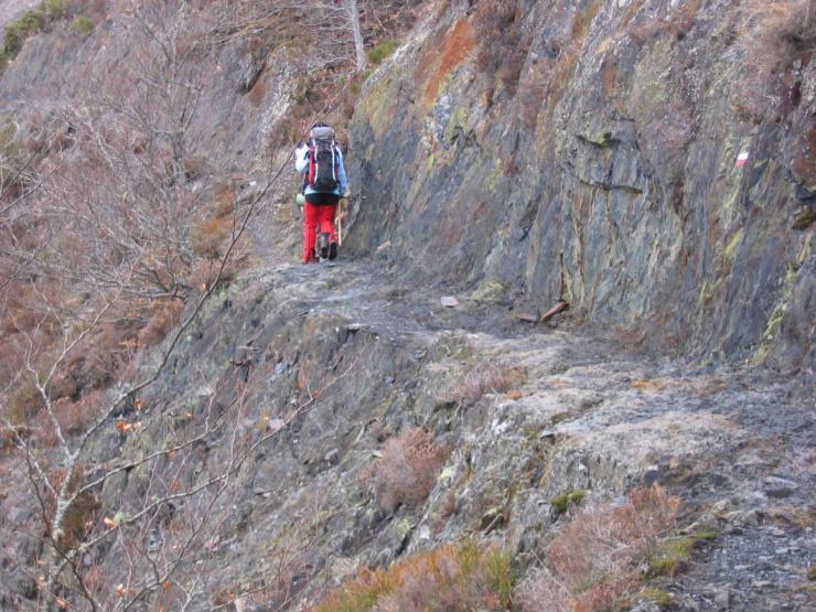 Poursuivre (nord) à gauche de la cabane le sentier de niveau qui est taillé dans le roc. Il traverse ensuite une prairie de fougère pour revenir en forêt. Il arrive bientôt à la