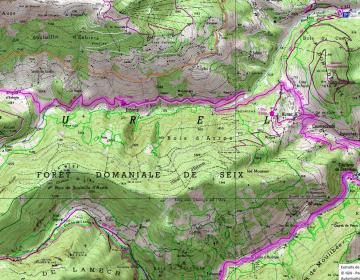 Le GR10 E traverse la combe d’Andraud pour arriver sur une crête et une bifurcation (1170m). Suivre à droite la piste qui rejoint des baraques forestières en ruines et le